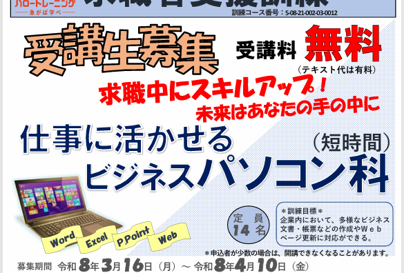 【募集終了】受講料無料で、2ヶ月の通学により、介護の知識、技術が学べます。