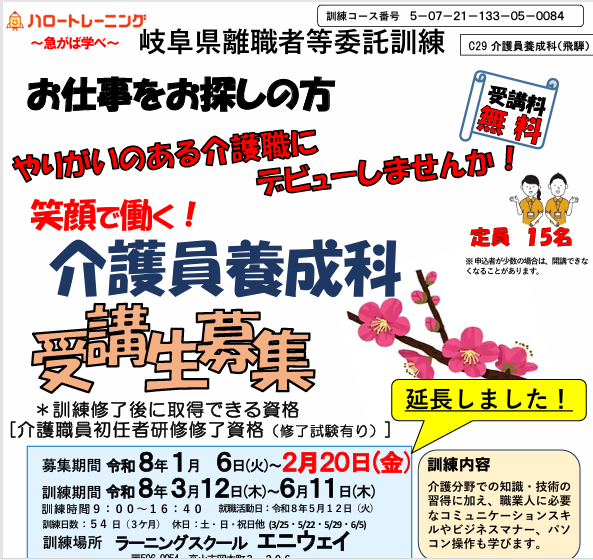職業訓練介護系 2023.02.062022.11.28 令和8年 3月開講 介護員養成科の受講者を募集しています。 2026年1月29日2026年2月10日 岐阜県 離職者等 委託訓練 「介護員養成科(飛騨)」の受講者…続きを読む令和7年2月開講『介護員養成科』の受講者募集は終了しました。 2024年12月4日2025年3月7日 岐阜県離職者等委託訓練 「介護員養成科」 介護分野での知識・…続きを読む9月開講『求職者支援訓練 介護職員初任者養成科(短時間)』の受講者募集は終了しました。 2024年7月11日2024年9月9日 9月開講『求職者支援訓練 介護職員初任者養成科(短時間)』の…続きを読む9月開講「介護員養成科」は募集を終了しました。 2023年7月21日2023年9月11日 9月開講の介護職員養成科は募集を終了しました。 岐阜県離職者…続きを読む笑顔で働く!介護員養成科(短期間)受講者募集終了しました。 2023年3月29日2023年4月26日 【募集終了】受講料無料で、2ヶ月の通学により、介護の知識、技…続きを読む令和5年1月開講 介護員養成科 2022年12月8日2023年4月26日 【募集終了しました】 離職者等委託訓練介護員養成科の募集を終…続きを読む職業訓練 10月開講 介護員養成科 2022年8月25日2023年2月16日 【訓練終了しました】 基本から応用に至る介護の知識・技術を習…続きを読む